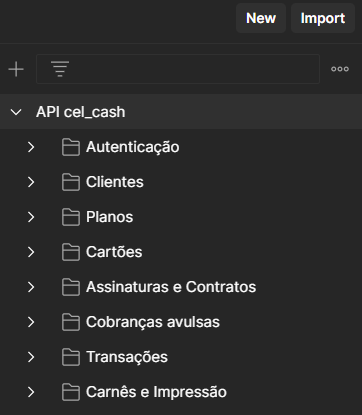 Após realizado o download da collection do Postman do cel_payments, para importar no Postman, basta clicar no botão "Import", selecionar o arquivo do download da collection e confirmar a importação.